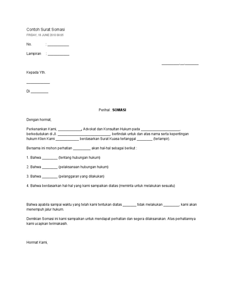 Kemudian, somasi dapat dimaknai sebagai surat peringatan sebagaimana dimaksud di dalam pasal 1412 kuhp yang isinya; Surat somasi pun dititipkan melalui perwakilan manajemen gedung. There are no stories available. Apakah somasi hanya dapat diajukan oleh kalangan sarjana hukum dalam arti kami selaku pengusaha harus menyewa jasa sarjana hukum setiap kali kami hendak. Contoh surat somasi atas pembayaran harga barang.